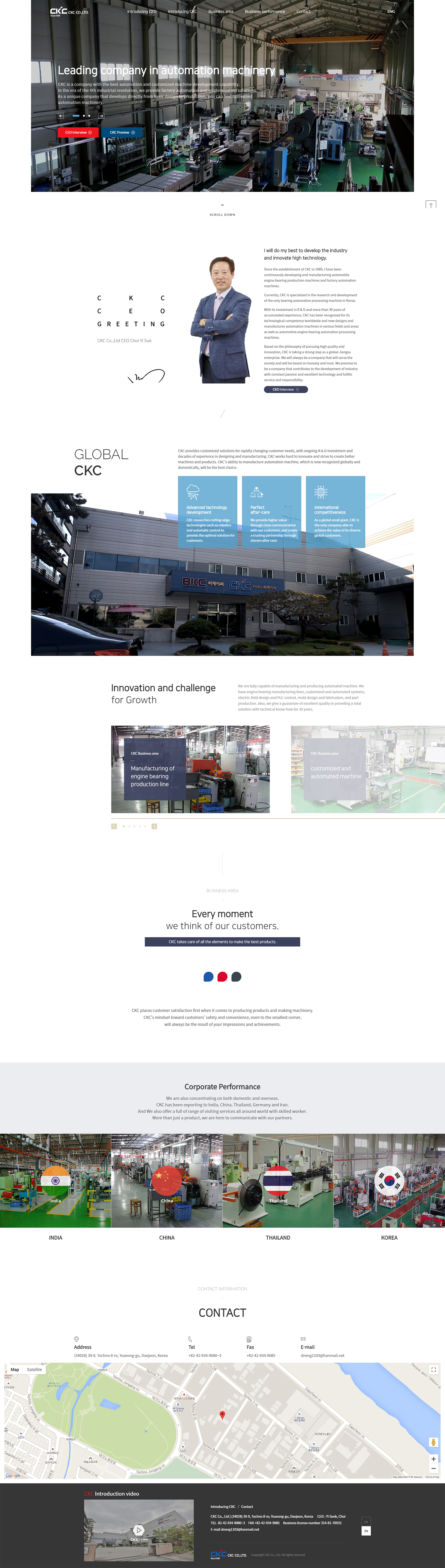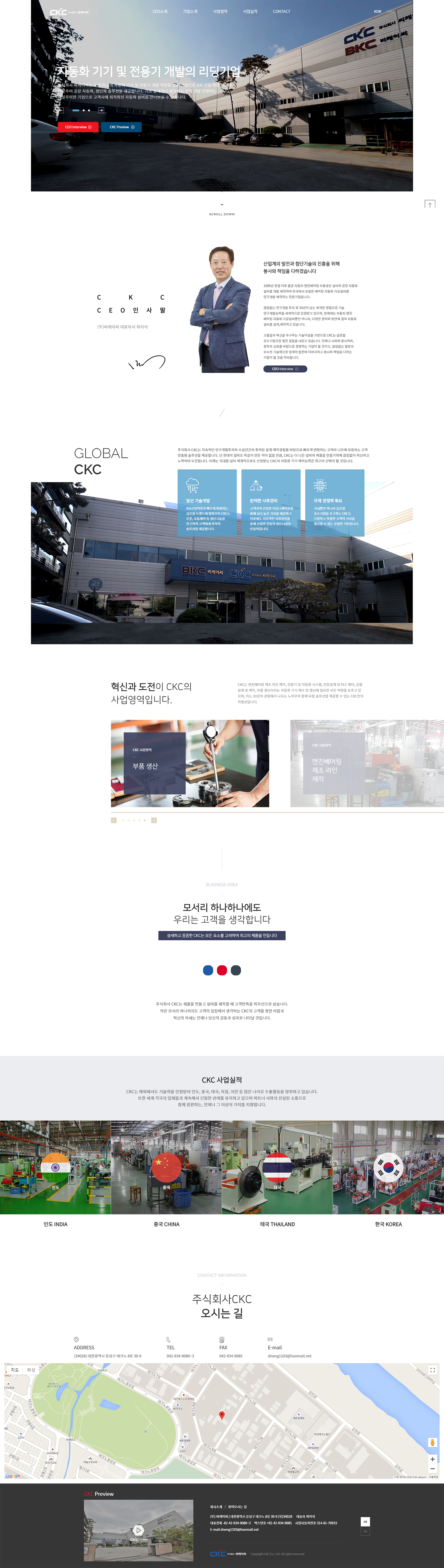 자동화 기기 및 전용기 개발의 리딩기업인 주식회사 CKC는 끊임없는 연구개발 투자 및 30년이 넘는 축적된 경험으로 기술연구개발능력을 세계적으로 인정받고 있습니다. 그래서 홈페이지는 영문버전까지 구축을 하였으며, 회사 PREVIEW영상 및 CEO INTERVIEW 영상을 활용하여 원페이지로 구성을 하여 사용자가 적은 페이지 이동과 긴 글을 읽지 않아도 쉽게 파악할 수 있는 홈페이지로 기획 및 구축했습니다.
