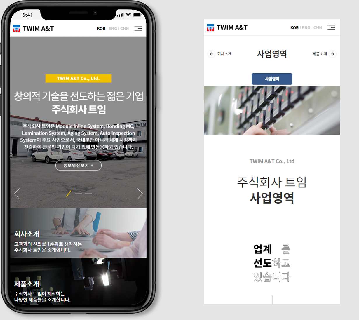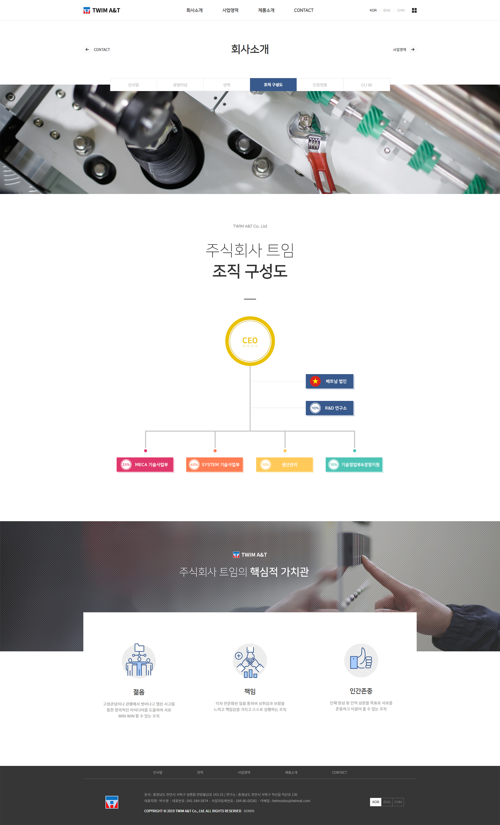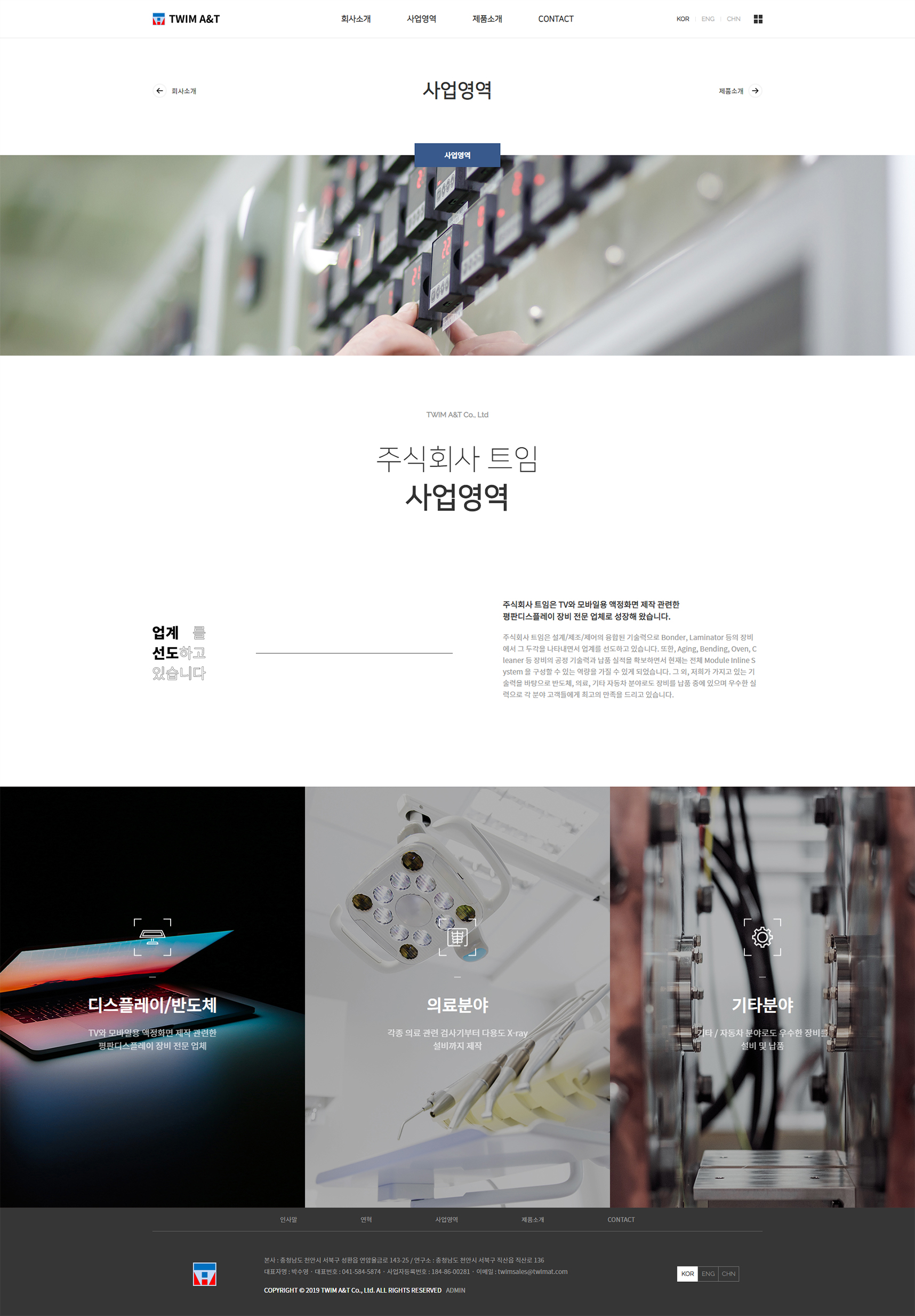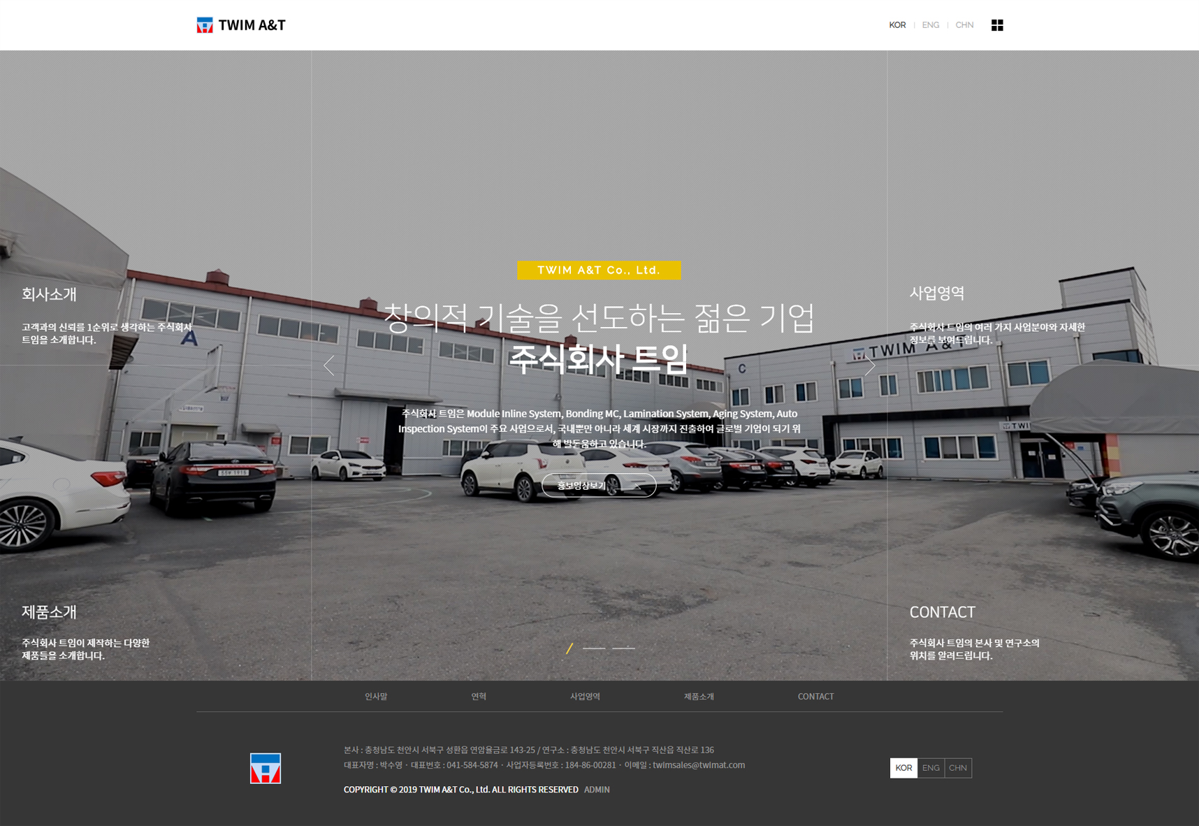 창의적 기술을 선도하는 젊은 기업으로서 트임만이 가지고 있는 특유의 유연함과 끈기를 통해 새로운 시대에 대한 변화에 두려워하지 않을 자신이 있다라는 마인드를 메인페이지에 담기 위해 업무 모습과 공장 가동 모습 등이 담긴 영상을 활용하고, 영어 및 중국어까지 총 3가지 언어의 다국어 홈페이지를 기획 및 구축했습니다.